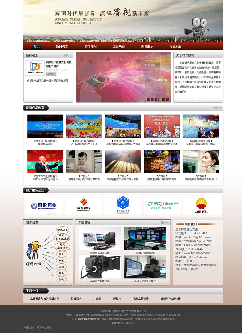 成都時代睿視文化傳播有限公司是一家專業從事影視包裝制作、影視劇拍攝、企業宣傳片制作、產品宣傳片、視覺創意設計、文藝活動、大型賽事策劃執行、品牌推廣、整合營銷、媒體運營等文化產業項目的綜合型文化創意服務公司。在當下文化產業大繁榮的時代背景下,時代睿視覺不斷追求創新,先后服務于國有大型央企中國石油、中國銀行、成都印鈔有限公司;一流民營企業通威集團、華西希望集團等知名企業集團,得了到業界同仁的高度認可。